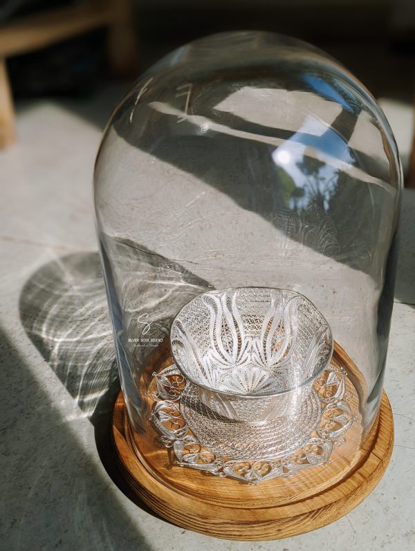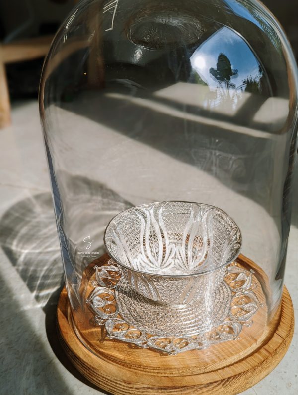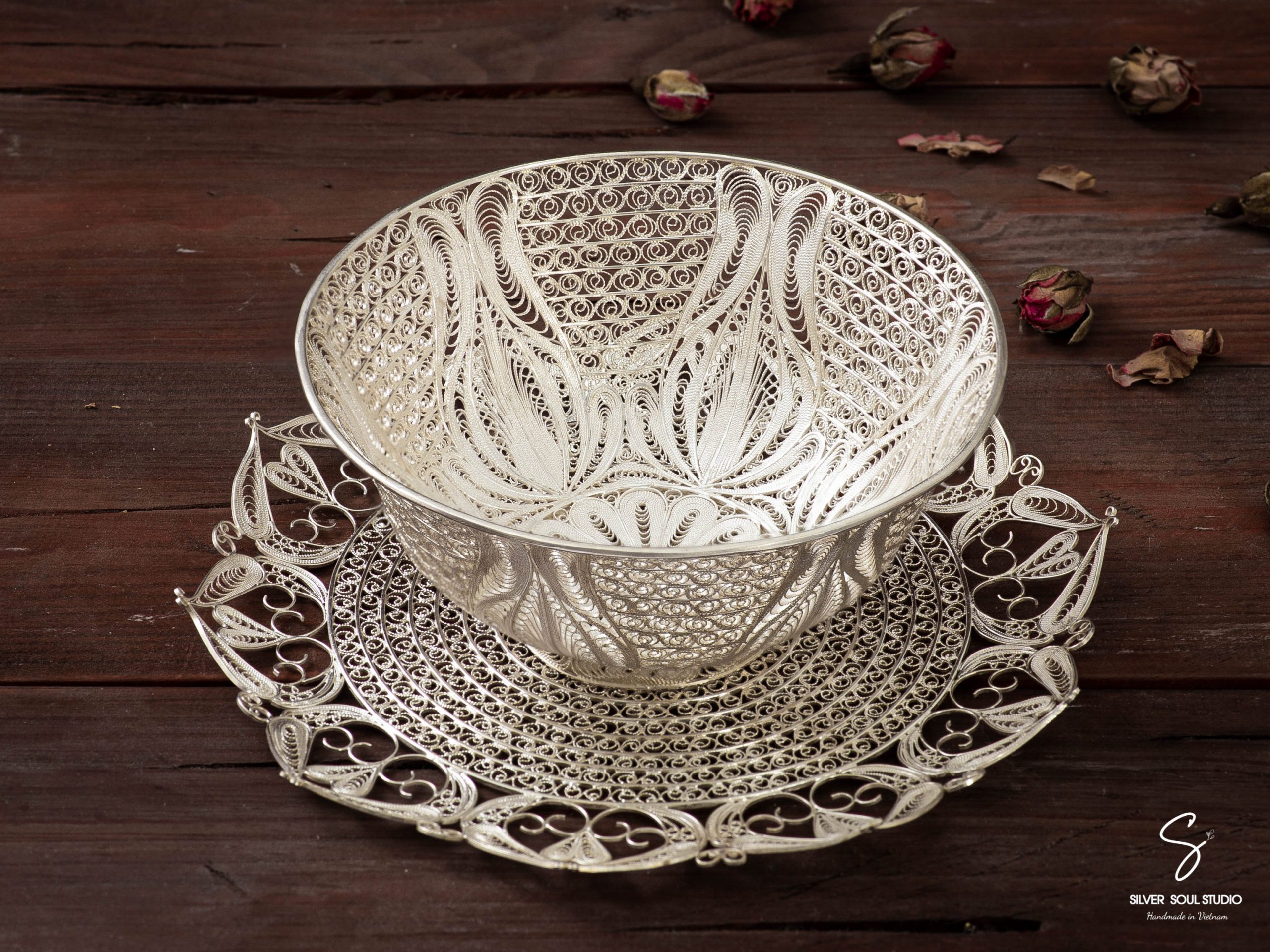 Bộ bát đĩa bạc được uốn thủ công hoàn toàn từ bạc ta nguyên chất theo phương thức truyền thống.