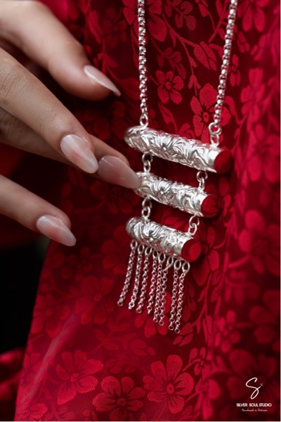 Dây chuyền Oriental charm. Chuỗi 3 tầng ống trầu được chạm thủ công trên nền chất liệu bạc ta nguyên chất