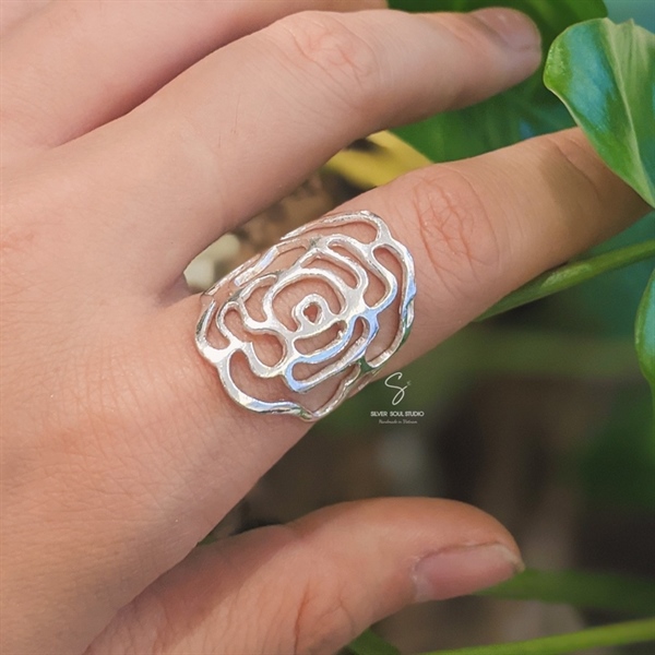 Nhẫn hoa hồng được làm từ chất liệu bạc.